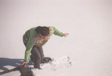 finde es lustig. Wir schütteln den Schnee vom Zelt, packen es zusammen und